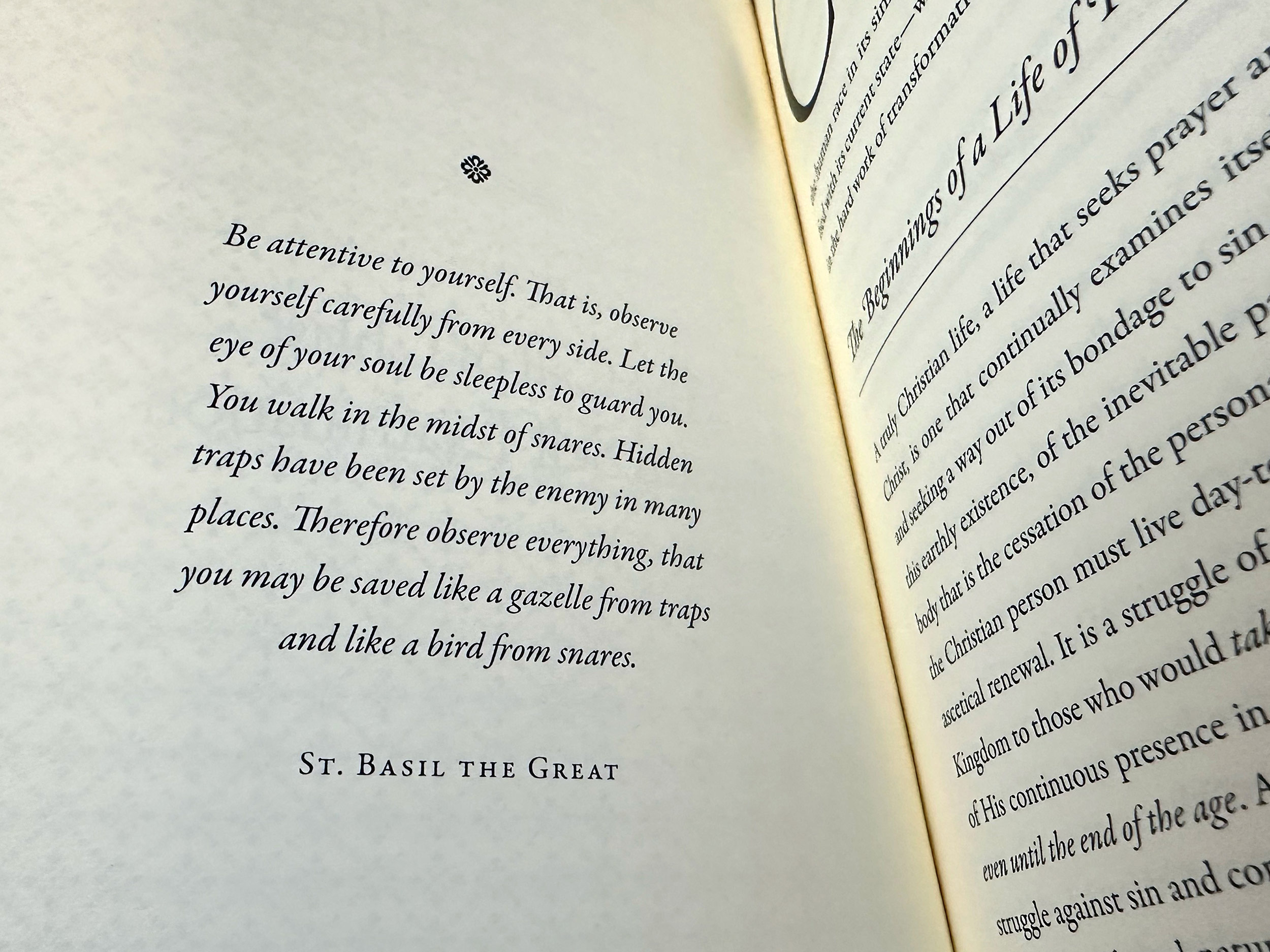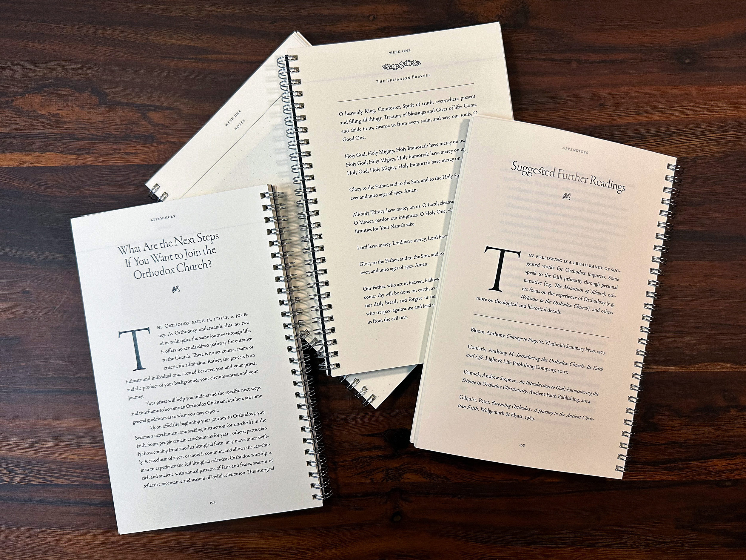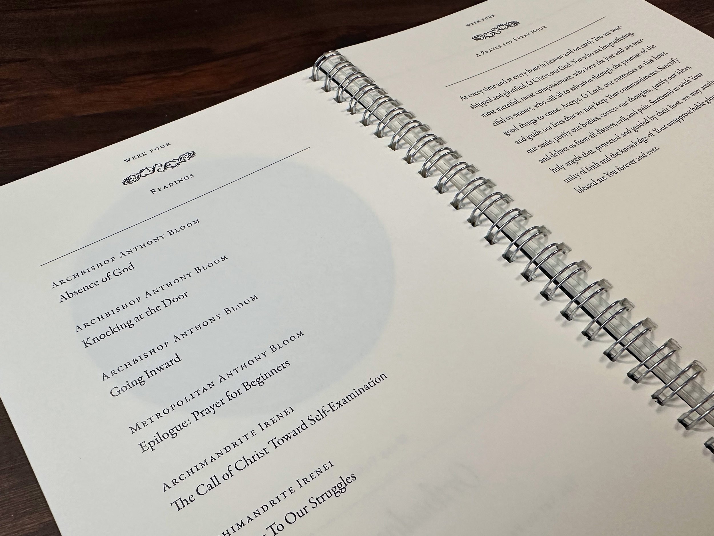 Ephemeral print design. L–R: A guided teen workbook for going through four epistles during Lent. A small prayer card for reflecting on St. Ephraim’s words.